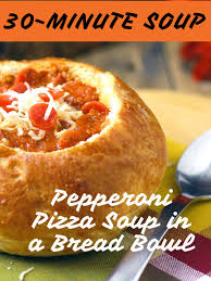 30 Minute Pepperoni Pizza Soup In Bread Bowls Recipe In 2020 Bisque Soup Recipes Bread Bowls Pizza Soup
