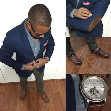 Street Style Men Fashion Men S Fashion Blue Blazer Sports Jacket With Brown Elbow Patches Blue Chamb Green Pants Men Olive Green Pants Men Blue Outfit Men